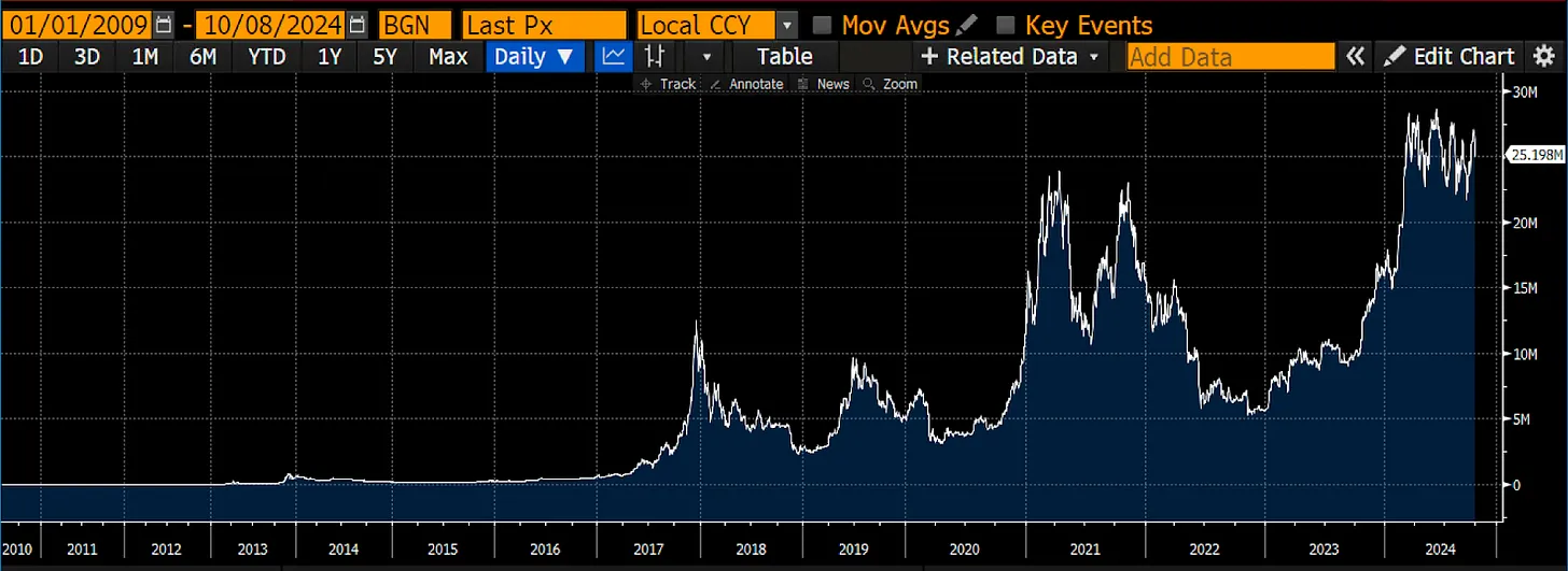 作为投资者和交易者,我们正处在一条既危险又刺激的滑雪坡道上。一方面,随着中国正式启动大规模印钞的再通胀计划,各大国家或经济体都在降低货币价格并增加货币供应量。这正是应该承担最大长期风险的时候,显然我指的是加密货币。可是,如果以色列与伊朗的冲突继续升级,导致波斯湾的油田被摧毁、霍尔木兹海峡关闭,或者爆发核冲突,加密市场可能会遭受巨大打击,正如人们常说的,战争是无法投资的。
