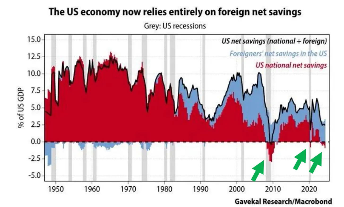 美国政府通过借贷而非储蓄来购买物资,这是上面图表传递的信息。为以色列提供免费的武器意味着美国这个负债累累的国家需要进一步增加借款。那么问题来了:如果美国的国家储蓄是负的,谁会购买这些债务呢?图中的绿色箭头标出了美国国家净储蓄为负的情况。正如 Luke Gromen 所指出的,这些箭头对应以下几个情况: