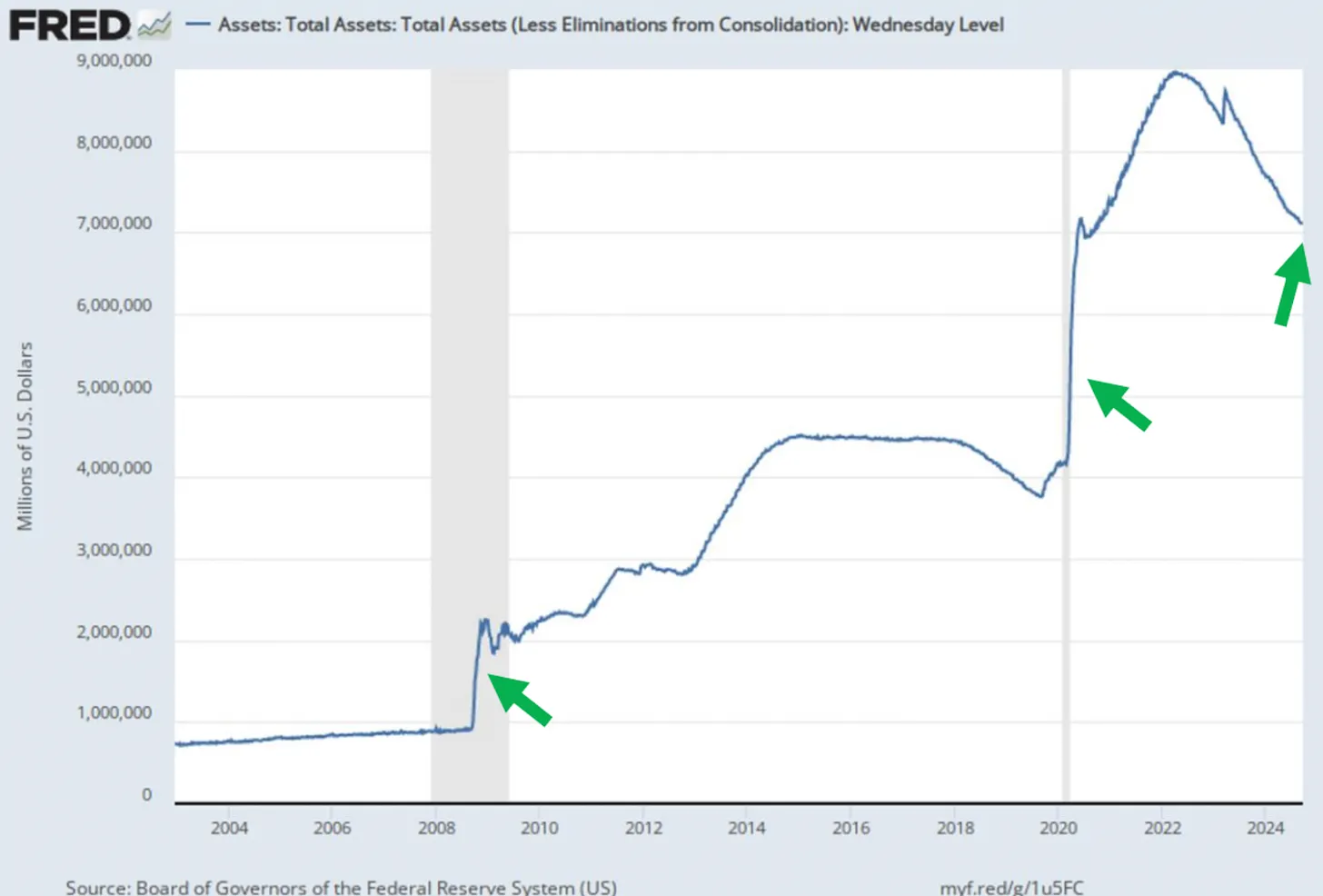 图表上的箭头对应于美联储资产负债表规模的急剧增加。随着美国在支持以色列军事行动的过程中不断增加借款,类似于 2008 年全球金融危机(GFC)和新冠疫情封锁之后,美联储或商业银行系统的资产负债表将会逐渐上升,以购买这些新增的债务发行。