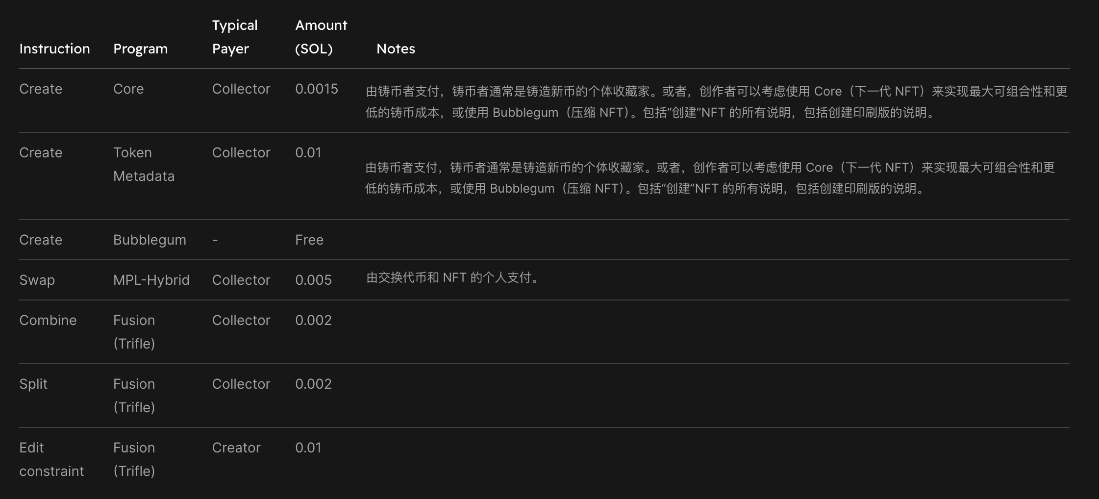 Metaplex 程序库(MPL)费用标准,图源来自:Metaplex