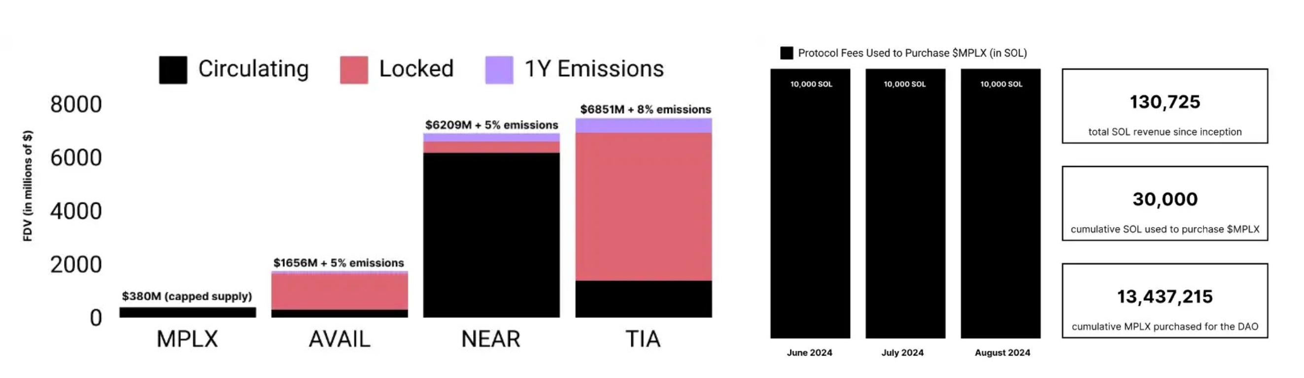 左:MPLX 代币流通情况及 FDV 对比,右:MPLX 代币回购情况;图源来自:Sistine Research