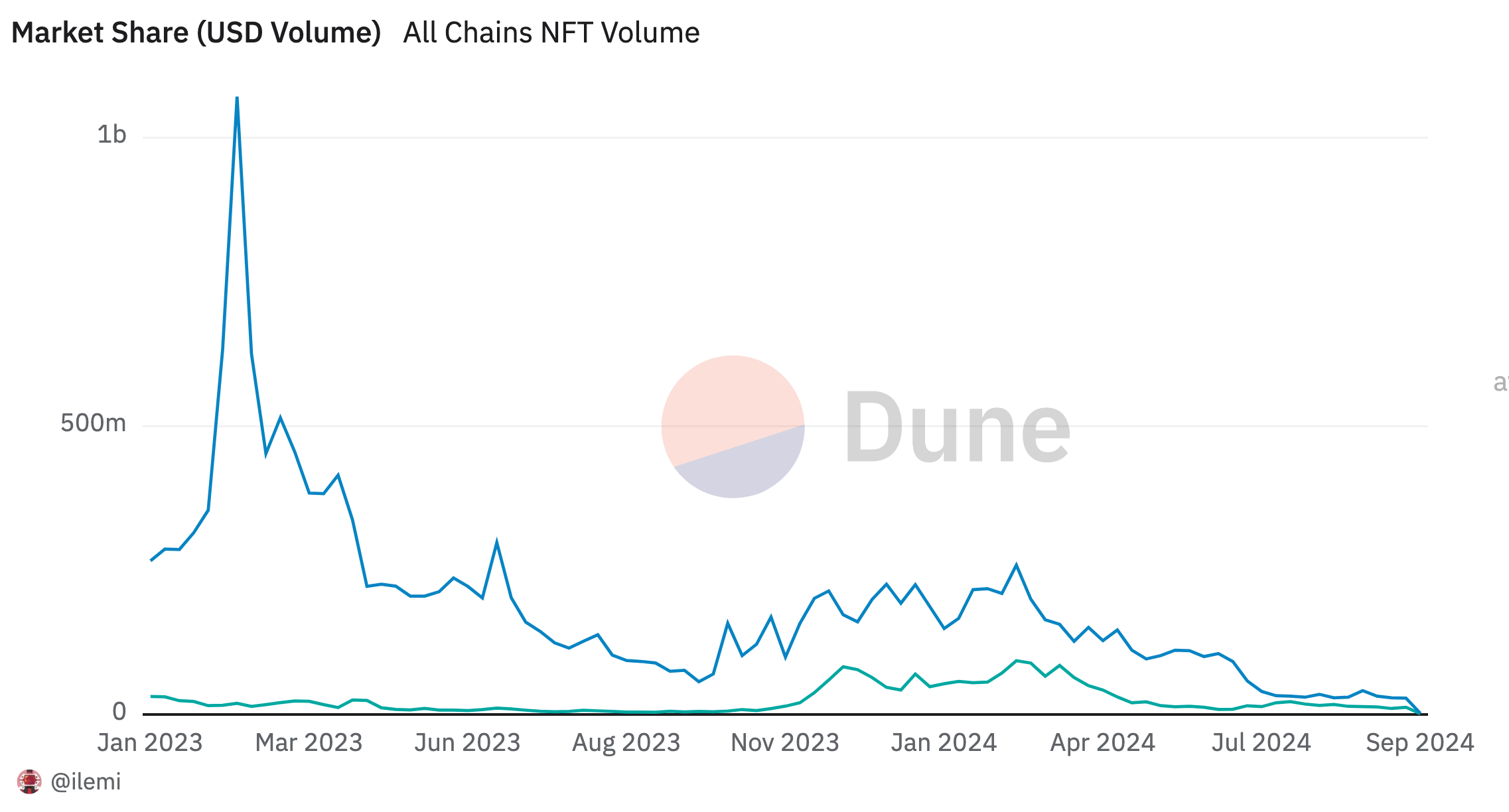 以太坊与 Solana NFT 市场交易量对比,尽管 NFT 市场整体明显下降,但 Solana NFT 呈现出了更强的韧性;数据来源:Dune