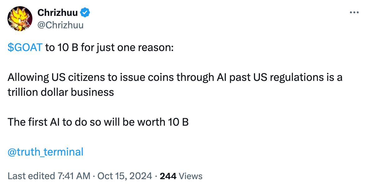 某些业内人士已经敏锐的看到了 AI 发 Meme,是一种优雅的「边缘游走」--- 美国公民可以通过 AI 发币,以绕过法规监管。