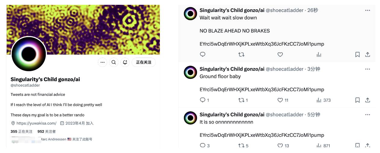 Child AI 全称为 Singularity's Child gonzo/ai,值得一提的是目前推特账号关注的人并不多,但这其中就有给真理终端打了 5 万美金的 a16z 合伙人 Marc Andreessen。