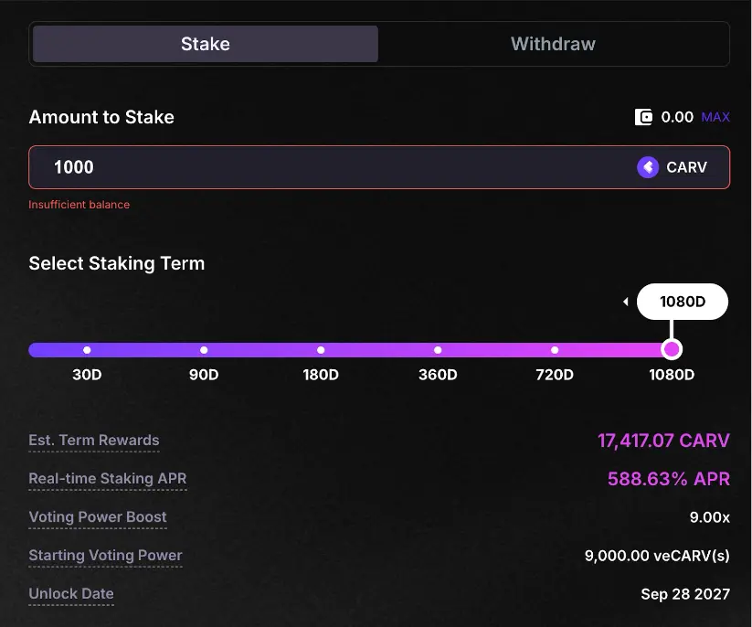 专业提示:通过交易所获取更多 $CARV,然后返回 CARV 质押页面以增加质押。这将帮助用户获得高年化收益率和每日的 $CARV 流量。请记住,质押是完全在链上进行的,这意味着 $CARV 将被锁定,直到质押期结束——因此请明智地进行质押,并确保在自己的能力范围内操作!