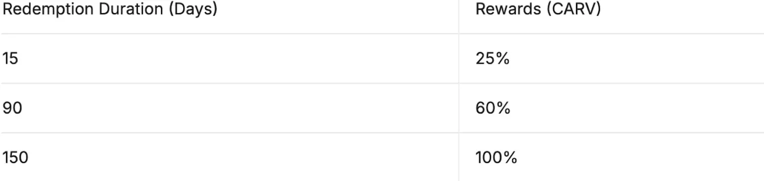 专业提示:在领取 veCARV 后,记住将其转换为 $CARV 需要一个解锁期。解锁期越长,赎回率越高——最高可达 100% 全额回报。快速提醒,一旦 veCARV 进入赎回期,它将不再具备治理投票资格。