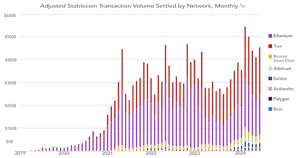去噪后,截至2024年6月,按结算价值计算,最受欢迎的区块链依次为:Ethereum、Tron、Arbitrum、Base、BSC 和 Solana。