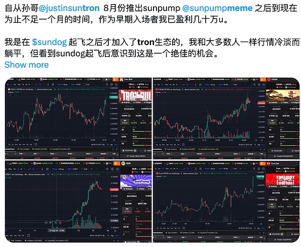 今年 8 月,Tron在市场波动中脱颖而出,得益于抓住 Meme 热潮(SunPump 等的推出),此前基于 Tron 的 meme 币 SUNDOG 继续飙升 ,几天内从 0.002 美元涨至 0.20 美元。(这一波Tron和SunPump首次出圈就是因为那天$Sundog的暴力拉盘,从内盘一路拉到70M,从而吸引了大量关注度,玩家也陆续进场,链上开始活跃,甚至带动Tron网络收入也创新高,这是典型的“小马拉大车”。)