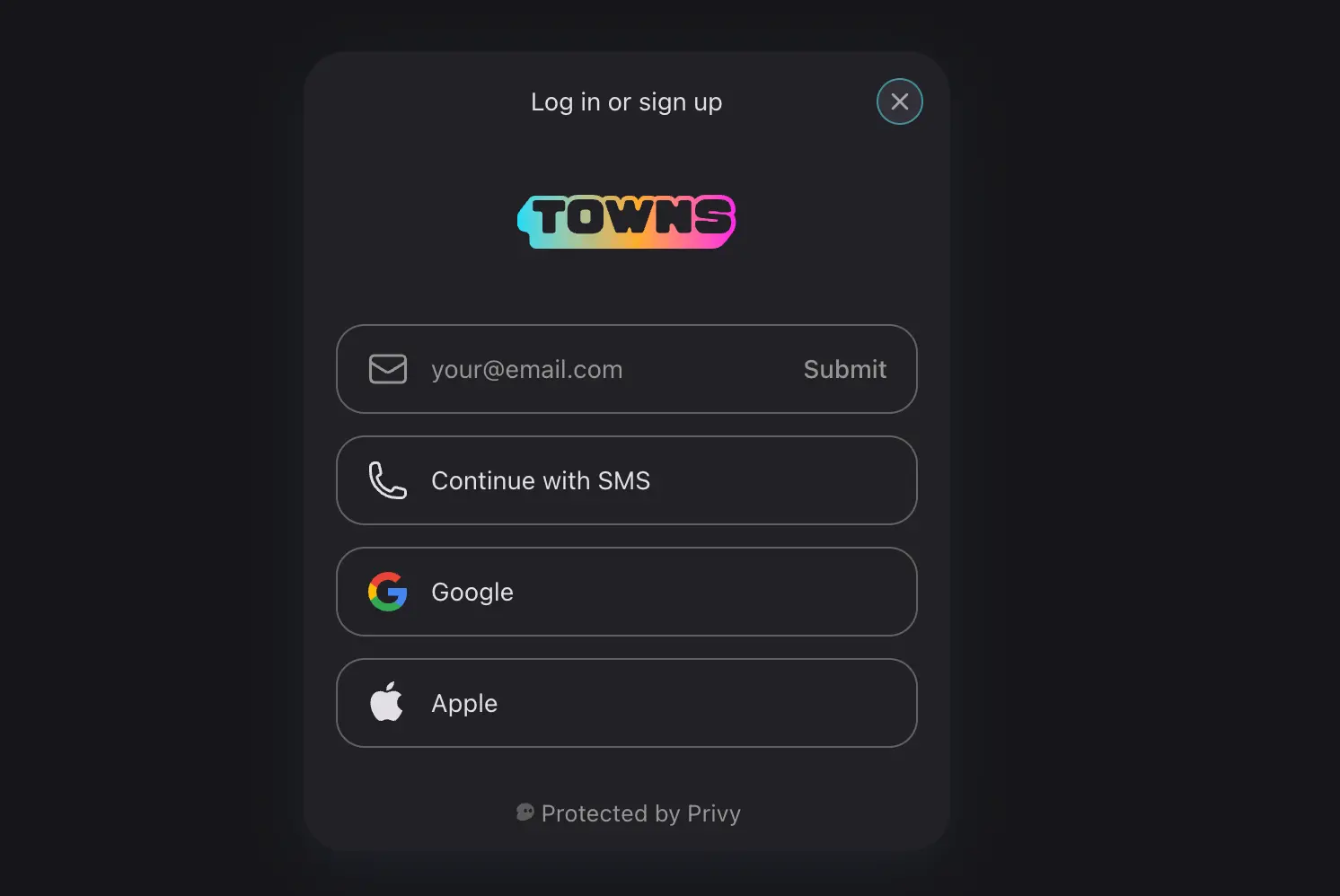 目前 Towns 提供了网页版和 IOS 应用,在访问 https://www.towns.com/ 后进入登录选项,可以看到并没有使用任何钱包进行登录的设计,而是直接给了第三方账户登录和手机登录等主流方式。