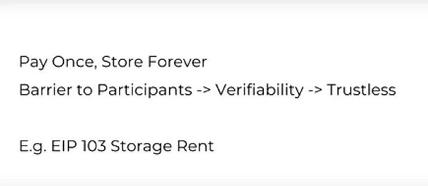 比如用户向链上存储数据只需要支付一次费用,但存储期限却是永久的,所以人们可以滥用存储资源,将任何东西都永久上链,最终网络里的全节点要承担越来越高的存储成本。这带来了一个问题:任何节点运行者想参与进该网络中的成本,都会被最大限度地提升。