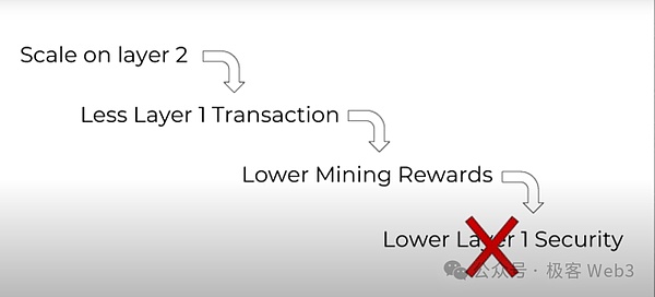 如果我们在Layer2上进行扩展,并将大量交易活动放到Layer2上进行,势必会导致Layer1上的交易数量下降,Layer1矿工/节点运行者的经济奖励也会相应降低。这样的话,Layer1矿工/节点运行者的积极性会下降,最终导致Layer1的安全性下降。这就是所谓的Layer1饥饿问题。