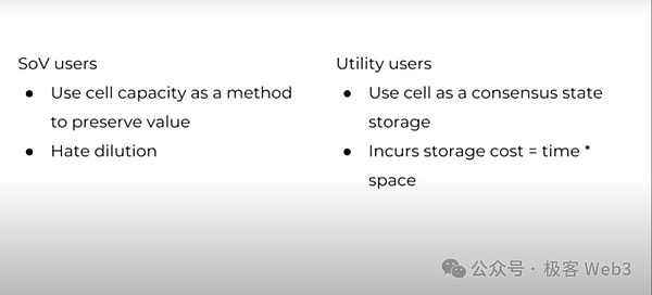 仍以CKB为例,SoV Users将原生资产CKB代币作为价值存储的手段,而Utility Users则利用Cell来存储状态。SoV Users对于CKB代币通胀导致的价格稀释是排斥的,而Utility User必须向矿工支付状态存储费用,该费用与数据存储的持续时间和占用空间成正比。