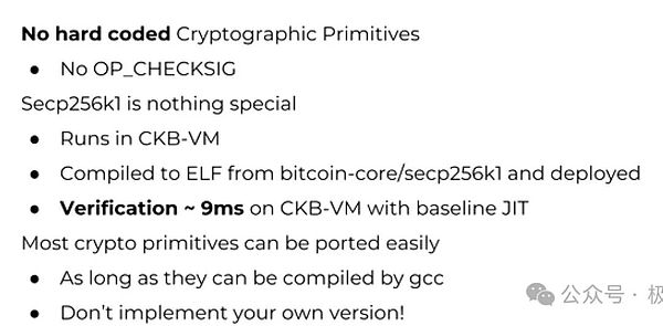 CKB也使用secp256k1作为其默认的签名算法,只不过是运行在 CKB-VM 中,而不是作为硬编码的加密原语。