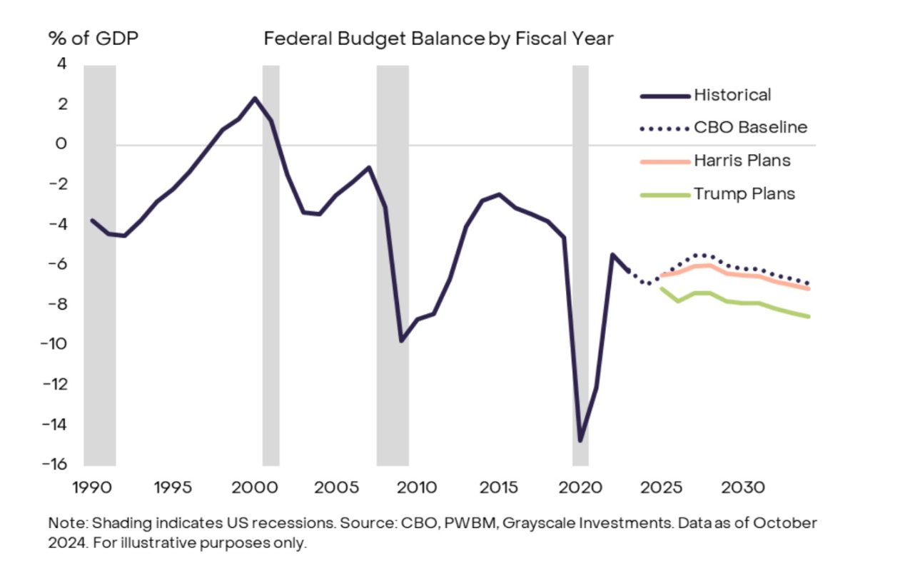 Grayscale Research 认为,在其他条件相同的情况下,中期内巨额预算赤字将对美元产生负面影响,而对比特币产生正面影响。