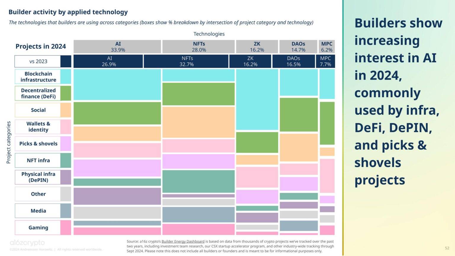 加密货币开发者也与人工智能有着密切的联系。根据我们的开发者能量仪表板,大约 34% 的加密货币项目表示他们正在使用人工智能,这一比例比一年前的 27% 有所增加。应用人工智能技术最常见的领域是区块链基础设施项目。
