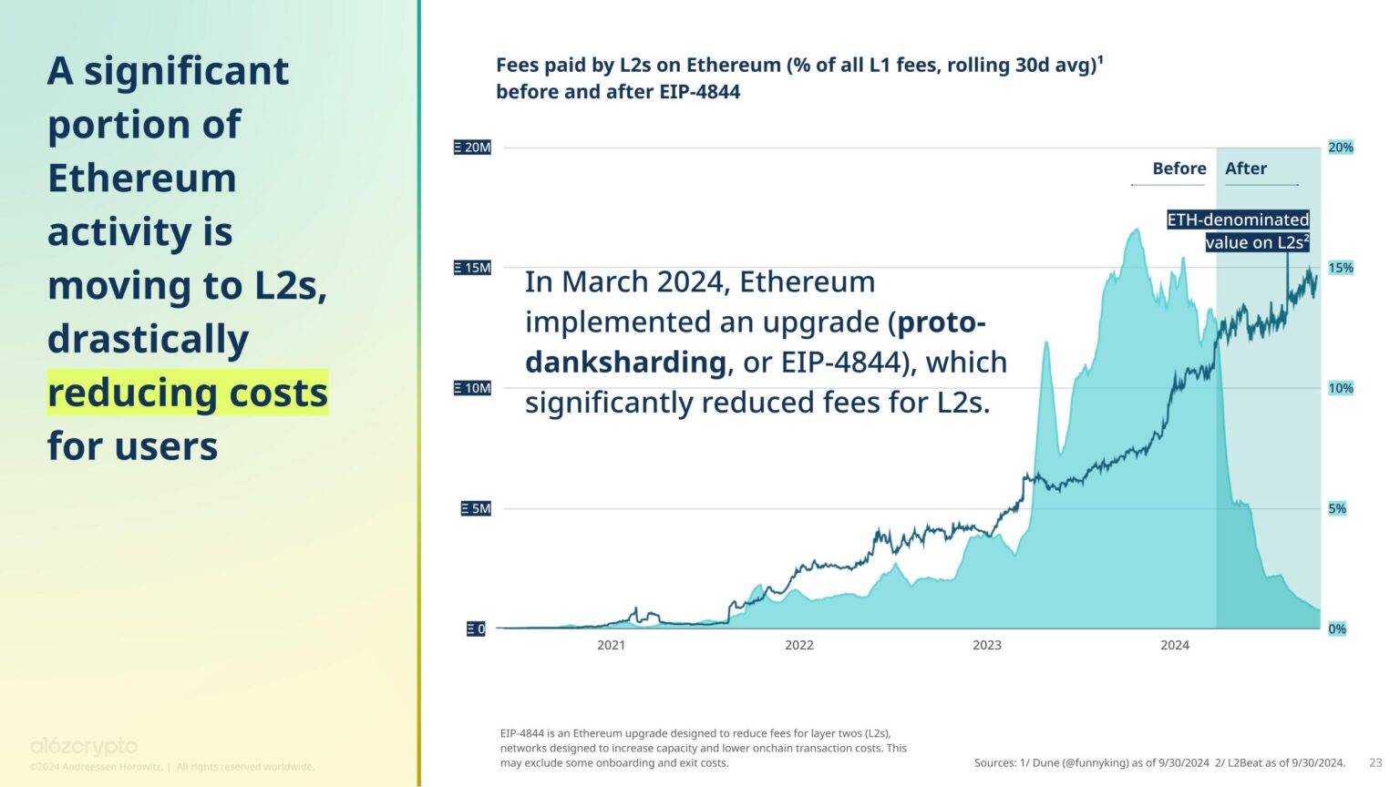 更让人惊讶的是,以太坊在 2024 年 3 月推出的年度重大升级 Dencun,也被称为「protodanksharding」或 EIP-4844,这一升级显著降低了 L2 网络的费用。自那时起,尽管 L2 上的以太坊价值不断上升,但 L2 在以太坊上支付的费用却大幅下降。换句话说,区块链网络变得越来越流行,同时也更加高效。