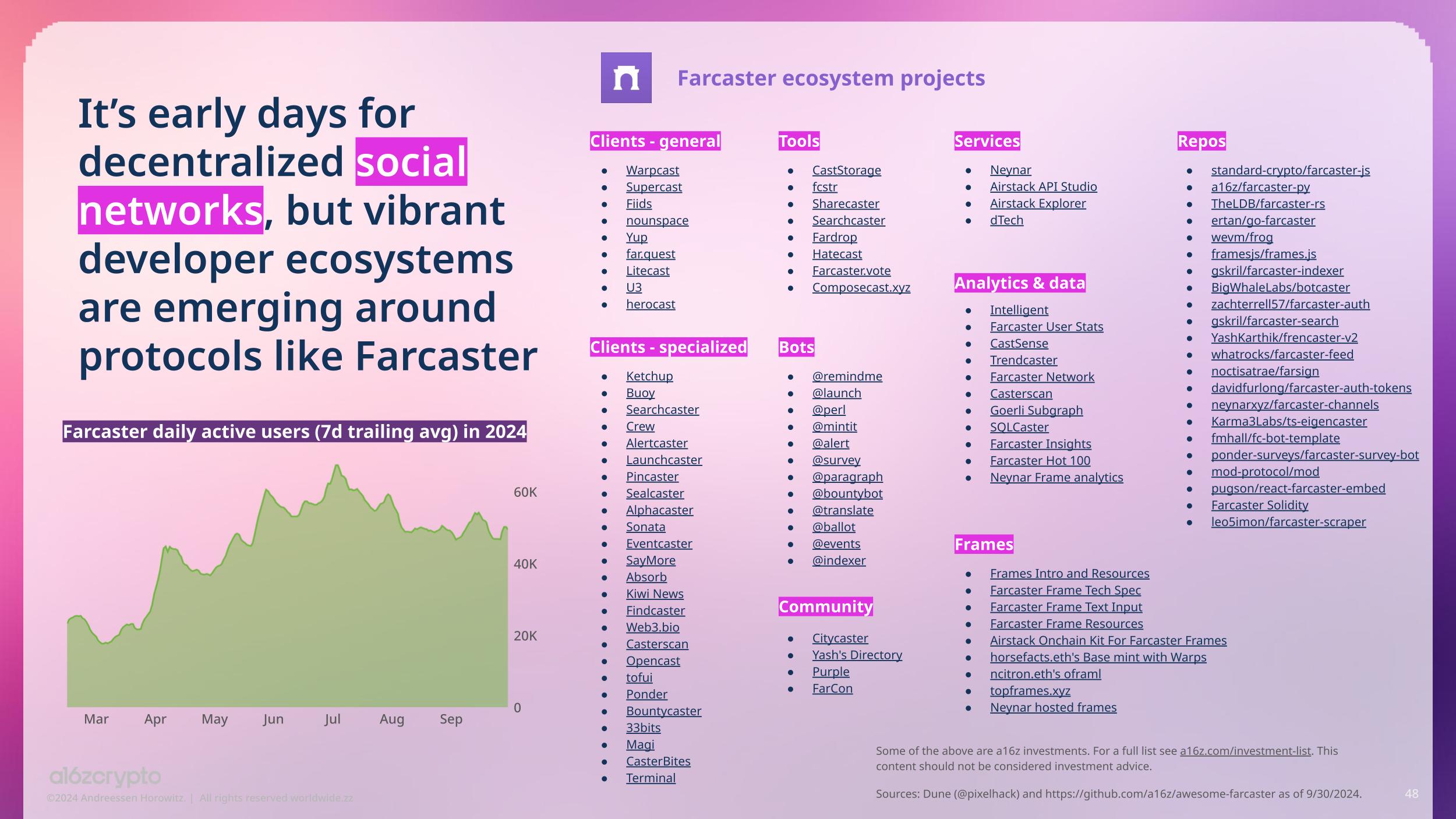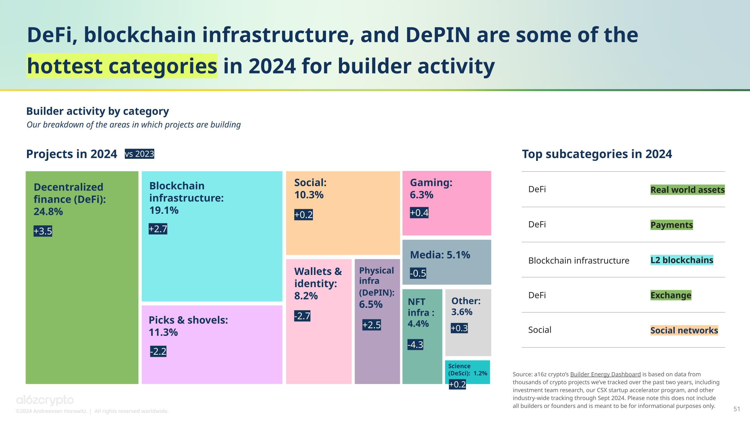 社交网络也是一个典型例子。尽管目前它们在每日链上活动中所占比例较小,但正吸引着大量开发者的关注:根据我们的开发者能量仪表板,2024 年有 10.3% 的加密项目与社交相关。事实上,像 Farcaster 这样的社交网络相关项目,已成为今年最热门的开发者子类别之一。