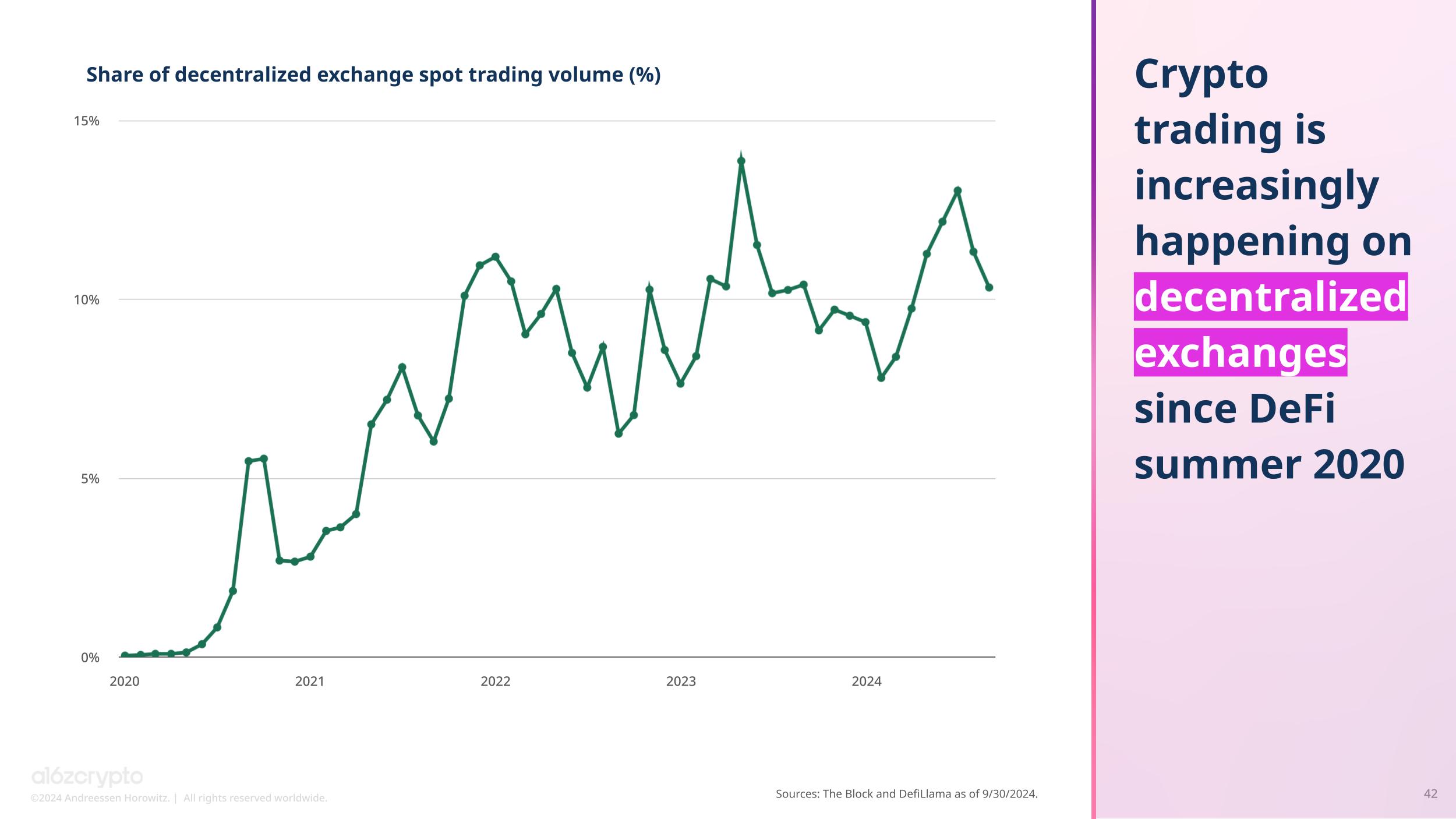 唯一比区块链基础设施更吸引开发者的领域是去中心化金融(DeFi),它也占据了加密货币使用的最大份额,每日活跃地址中有 34% 与 DeFi 相关。自 2020 年夏季 DeFi 兴起以来,去中心化交易所(DEXs)已经增长到占据现货加密交易活动的 10%,而这些交易在四年前都是在中心化交易所进行的。