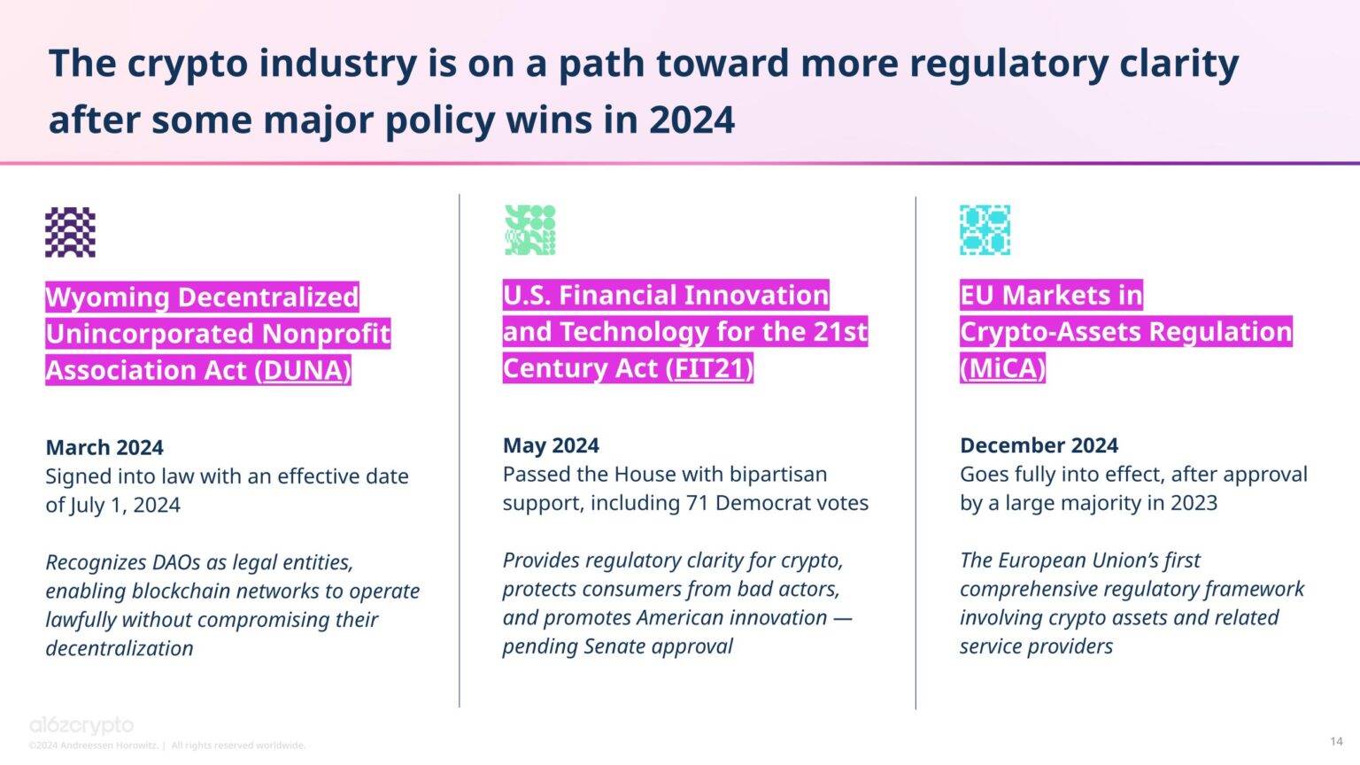 同样重要的是,在州一级,怀俄明州通过了《去中心化非公司非营利协会(DUNA)法案》,这项法律赋予去中心化自治组织(DAOs)法律地位,并允许区块链网络在不影响去中心化的情况下合法运营。