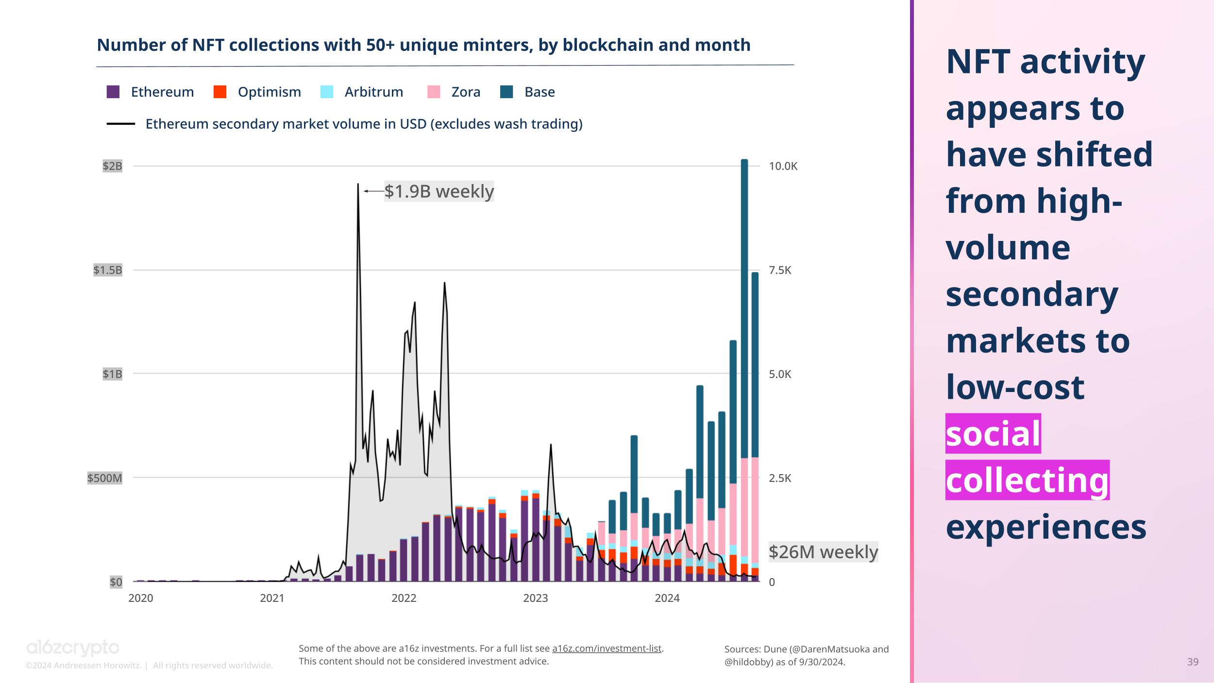 以 NFT 为例。几年前,由于加密交易费用较高,人们在二级市场上以数十亿美元的价格进行 NFT 交易。如今,这种现象有所减退,取而代之的是在 Zora 和 Rodeo 等社交应用上铸造低成本 NFT 收藏的新趋势。这标志着 NFT 市场的重大转变,而这种转变在交易费用大幅降低之前是难以想象的。