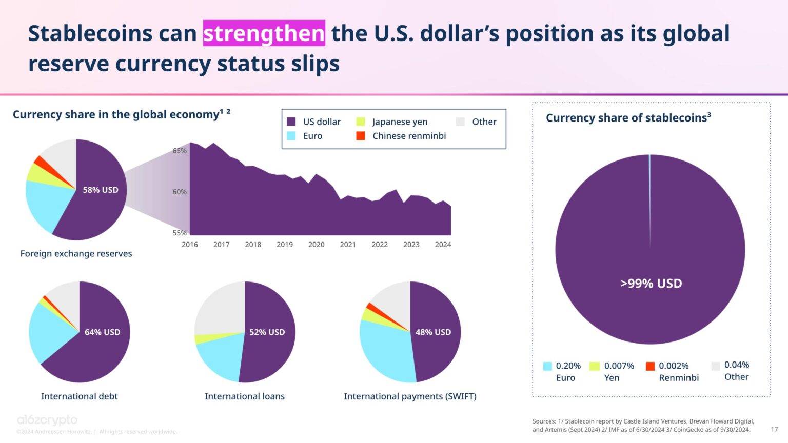稳定币作为目前最受欢迎的加密产品之一,是政策讨论的热点话题,已有多项相关法案在美国国会中讨论。在美国,推动这一讨论的因素之一是认识到稳定币可以在美元全球储备货币地位下降的情况下,仍然加强美元在国际上的影响力。目前,超过 99% 的稳定币是以美元计价的,这远远超过了第二大计价货币:欧元,仅占 0.20%。