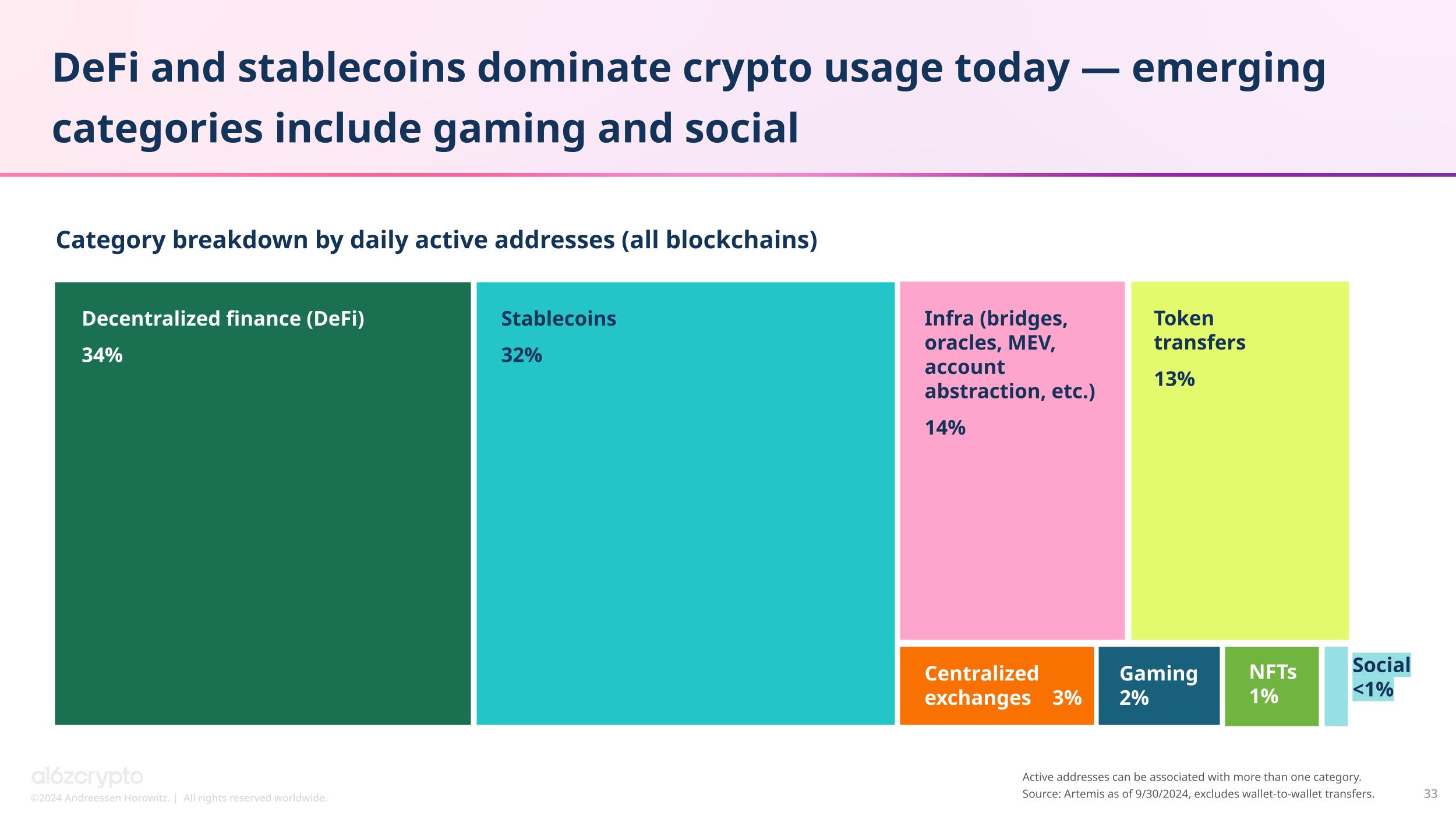 所有这些活动在使用统计数据中得到了体现。稳定币在每日加密货币使用中的占比接近三分之一,达到 32%,仅次于去中心化金融(DeFi)的 34%,这是通过每日活跃地址的比例来衡量的。其余的加密货币使用则分布在基础设施(如桥接、预言机、最大可提取价值、账户抽象等)、Token 转移以及其他新兴应用领域,如游戏、NFT 和社交网络。