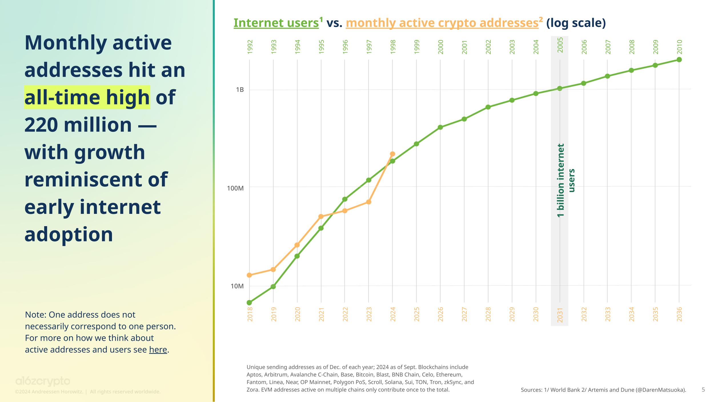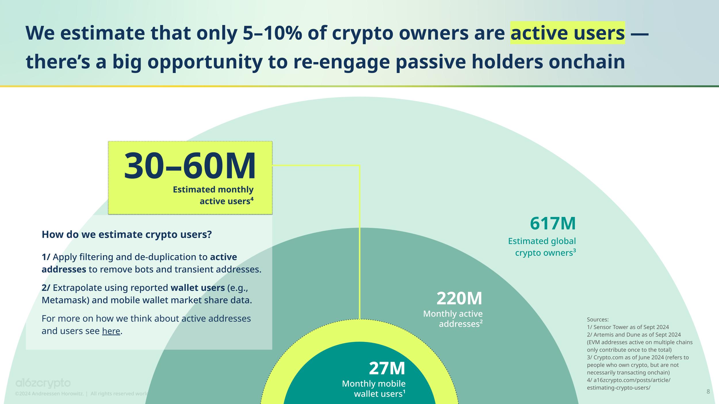 这种差距显示出与被动的加密货币持有者进行互动和重新吸引的巨大潜力。随着基础设施的重大改进带来了全新的、引人注目的应用程序和消费者体验,更多原本不活跃的加密货币持有者可能会转变为活跃的链上用户。