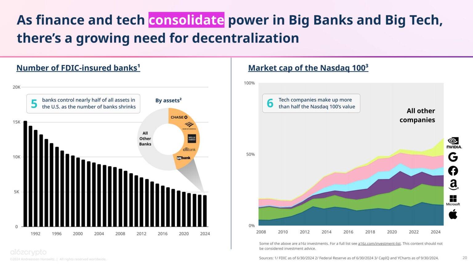 尽管仍处于初期阶段,DeFi 为美国金融系统中日益严重的集中化和权力集中问题提供了一种可行的替代方案。自 1990 年以来,美国的银行数量减少了三分之二,资产越来越集中于少数大型银行。