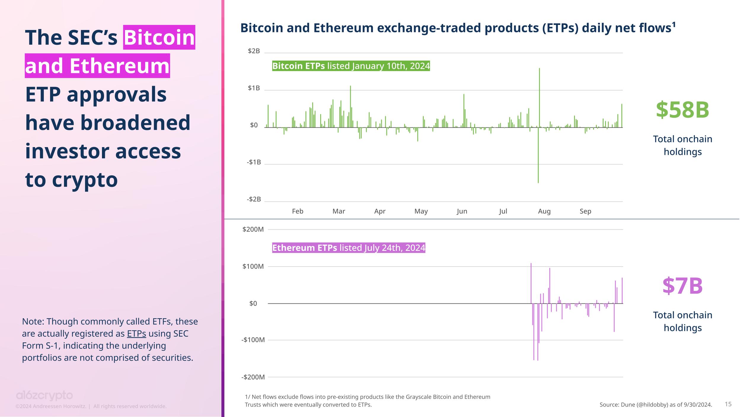 今年,比特币和以太坊交易所交易产品(ETPs)的上市可能是提升人们对加密货币兴趣的一个重要因素。随着这些 ETPs 为投资者提供更广泛的投资渠道,美国持有加密货币的人数可能会增加。目前,比特币和以太坊的 ETPs 已经拥有价值 650 亿美元的链上资产。(注:尽管通常被称为 ETF,这些产品实际上是通过 SEC Form S-1 注册的 ETP,表明其基础资产组合不包含证券。)