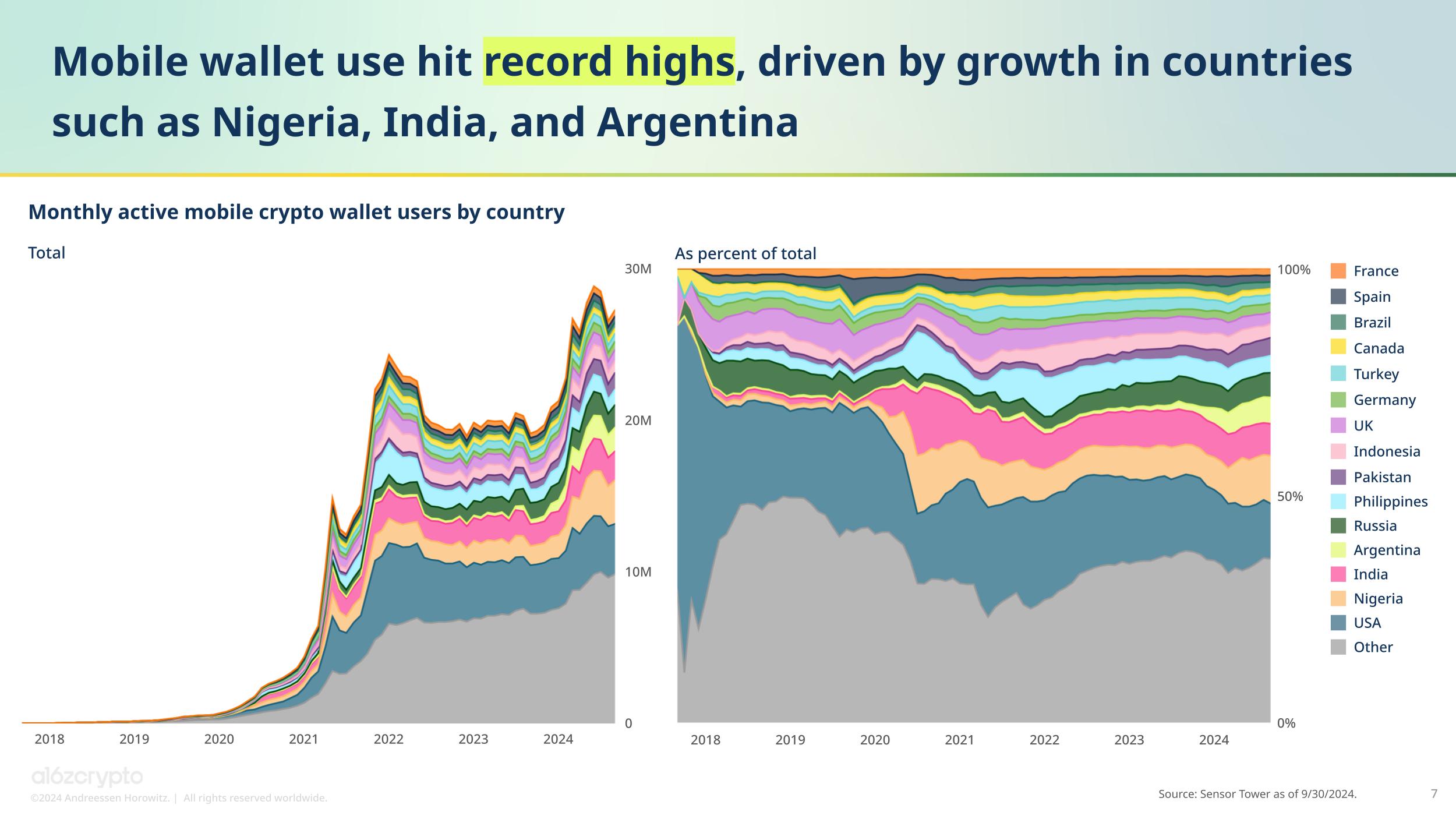 同时,2024 年 6 月,月度移动加密钱包用户数创下新高,达到 2900 万。尽管美国的月度移动钱包用户占比最大,为 12%,但随着全球加密货币的普及,以及更多项目通过地理限制来排除美国以实现合规,美国在总用户中的份额近年来有所下降。