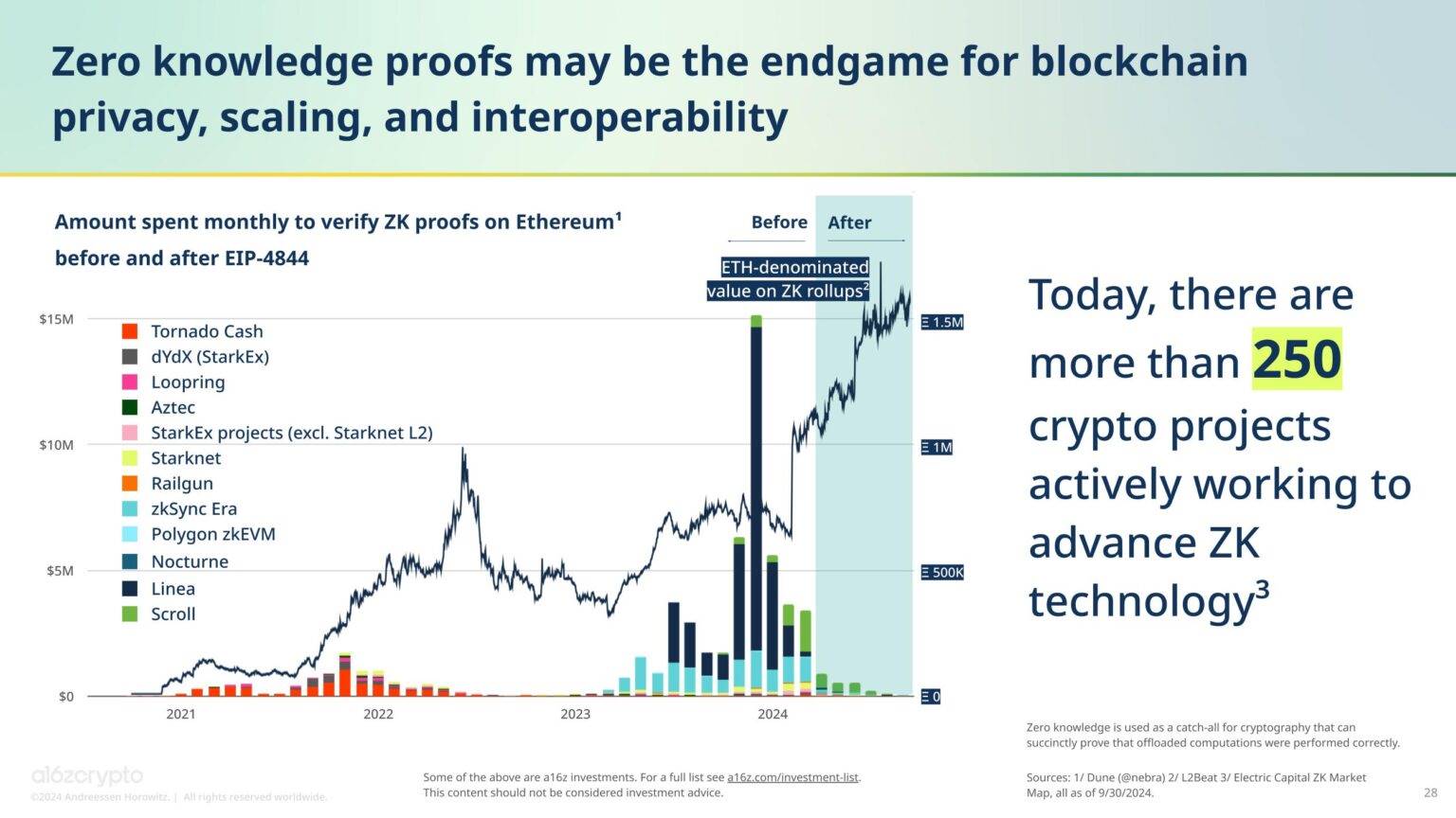 零知识(ZK)证明也有着类似的发展趋势,这项技术对区块链的扩展性、隐私性和互操作性有着重要影响。即便每月用于验证以太坊上 ZK 证明的费用在减少,ZK rollups 上的以太坊价值却在增长。换句话说,ZK 证明的成本也在降低,同时其受欢迎程度在提升。(这里我们用零知识作为总称,指的是能够简洁证明在 rollup 网络上执行的计算是正确的加密技术。)