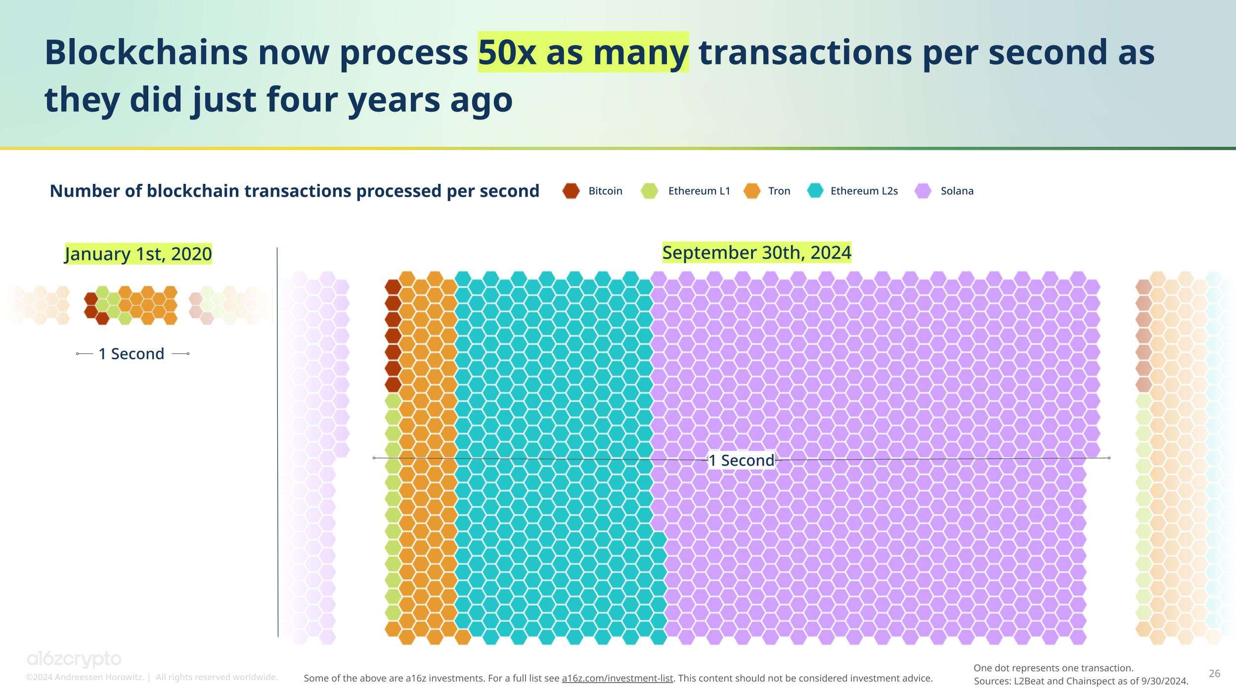 稳定币之所以如此受欢迎且易于使用,部分原因在于底层基础设施的进步。首先,区块链的处理能力正在不断提升。得益于以太坊 L2 网络和其他高吞吐量区块链的兴起,区块链每秒处理的交易数量已是四年前的 50 多倍。