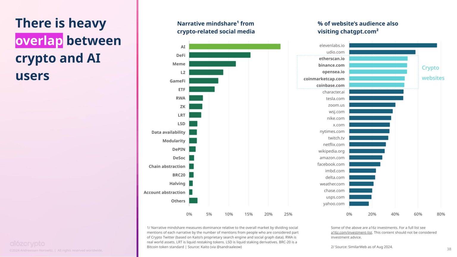 在社交媒体上,人工智能是加密货币领域的意见领袖们热议的话题之一。更令人意外的是,访问 chatgpt.com 的用户与访问顶级加密货币网站的用户之间存在大量重叠,这显示了加密货币和人工智能用户之间的紧密联系。