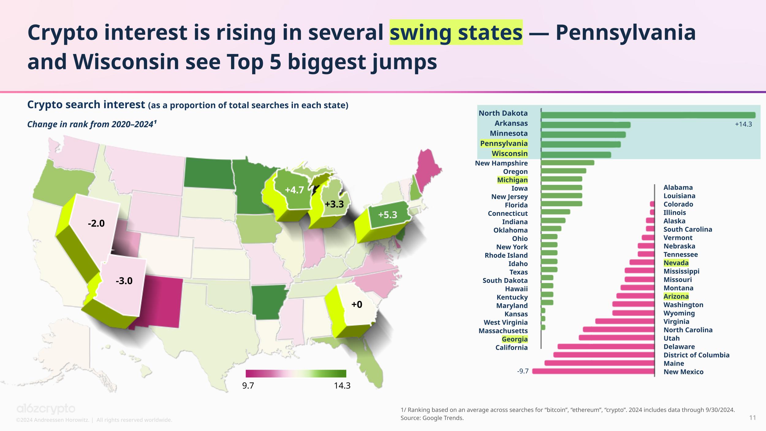 因此,我们对摇摆州的加密货币兴趣水平进行了测量。预计在 11 月将进行激烈竞争的两个关键州——宾夕法尼亚州和威斯康星州——自 2020 年上次选举以来,其在谷歌趋势中的加密货币搜索兴趣分别上升至第四和第五位。密歇根州在加密货币搜索兴趣方面排名第八,而乔治亚州保持不变。同时,自 2020 年以来,亚利桑那州和内华达州的兴趣有所下降。