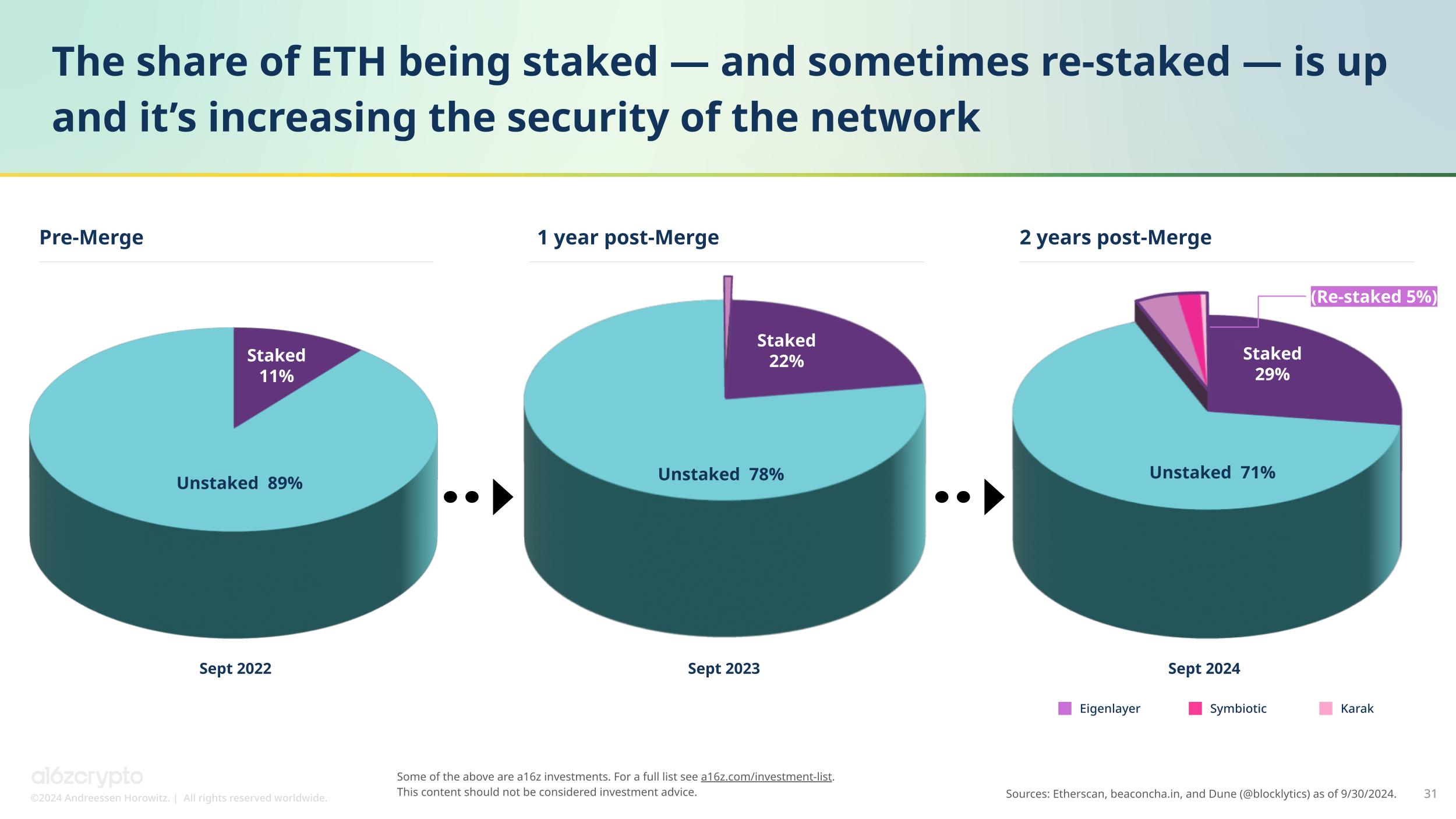 自从以太坊完成向权益证明机制的过渡以来,已经过去了两年多,这大大减少了网络的能源消耗和环境影响。自那时起,以太坊的质押比例从两年前的 11% 上升到了 29%,这极大地增强了网络的安全性。