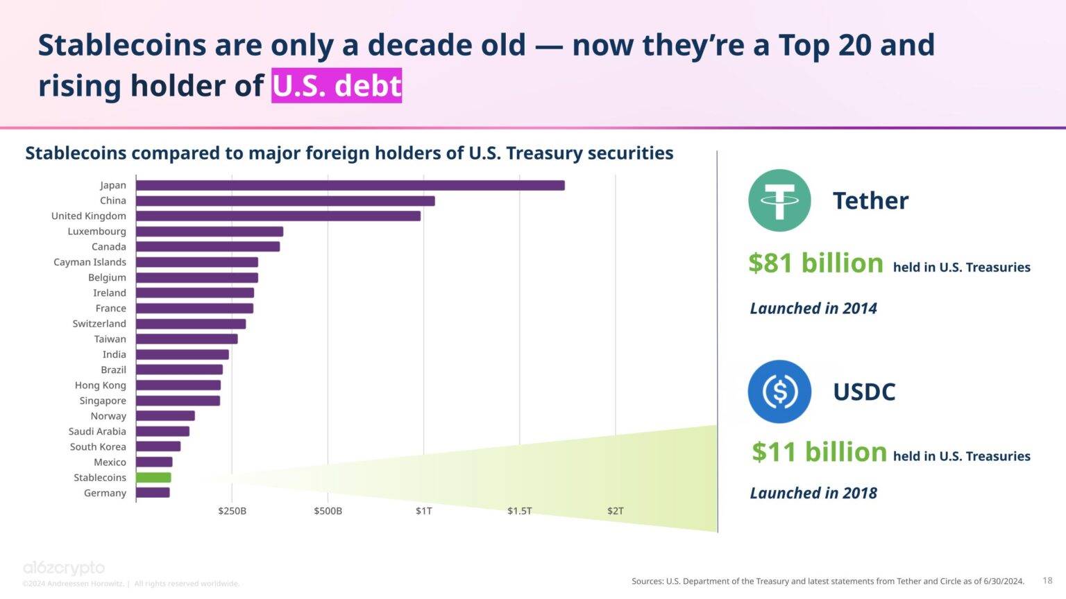 除了在国际上增强美元的影响力,稳定币还可能在国内强化美国的金融基础。尽管稳定币发展仅有十年,但它们已成为美国国债的前 20 大持有者之一,超过了德国等国家。
