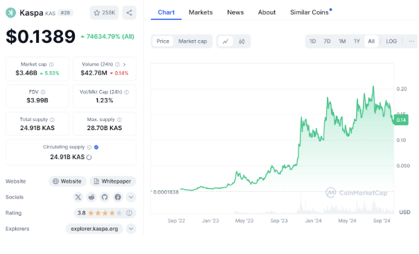 自 2021 年主网启动以来,Kaspa 总供应量为 287 亿 KAS,目前市值约为 34 亿美元。凭借强大且支持力十足的社区,Kaspa 在区块链行业中的地位持续上升。