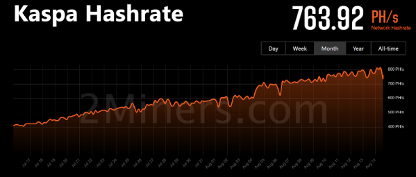 Kaspa 网络的哈希率反映了所有矿工的整体性能。目前 Kaspa 网络的哈希率为 763.92 PH/s,峰值为 2024 年 8 月 13 日的 843.44 PH/s。