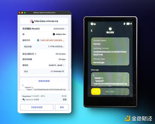 图:Keystone 硬件钱包与 Rabby Wallet 解析并显示 Permit2 签名交易