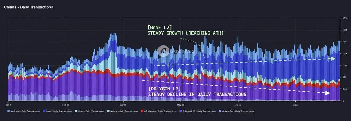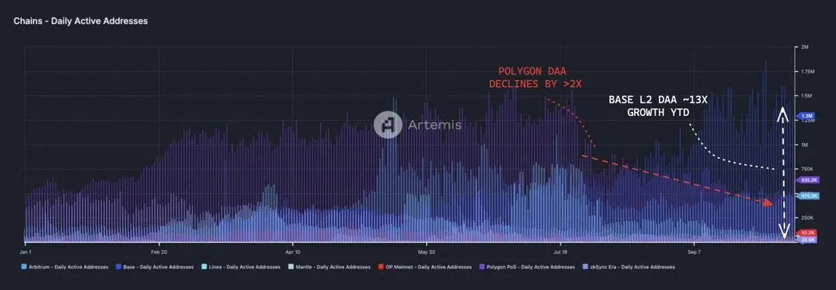 值得注意的是,自 2024 年第三季度开始,@0xPolygon L2 的 DAA 显著下降,而 Arbitrum 则保持稳定。