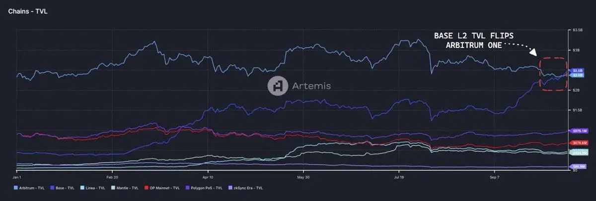 首先是重大转折——@base(25 亿美元)在 TVL(总锁定价值)上首次超越了 @arbitrum(24 亿美元)。