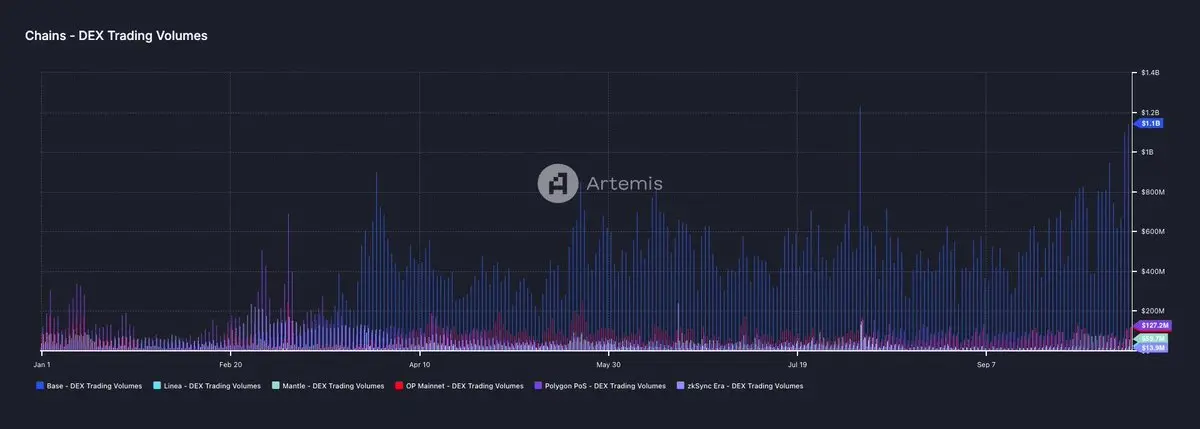 具体来看,自 2024 年初以来,@base 上的去中心化交易所(DEX)交易量增长了超过 15 倍。