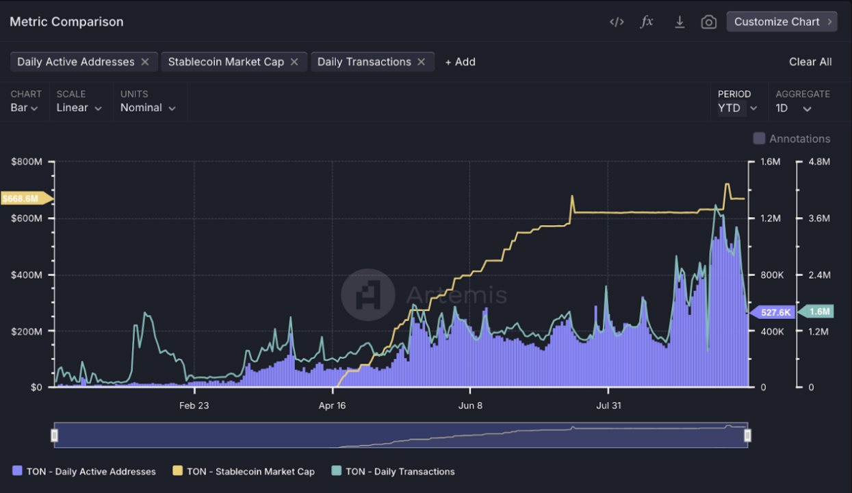 今年 4 月,Tether USDT 的整合为 TON 网络引入首个美元计价的稳定币。这类稳定币(如 USDT 或 USDC)的部署对网络的成功至关重要。自 Tether 推出以来,用户活动显著增长,每日交易量创下新高,超过 370 万笔,增长了 530% 以上。同时,每日用户数也大幅上升,9 月首次突破 100 万,近期达 110 万,自 4 月以来增长了 752%。