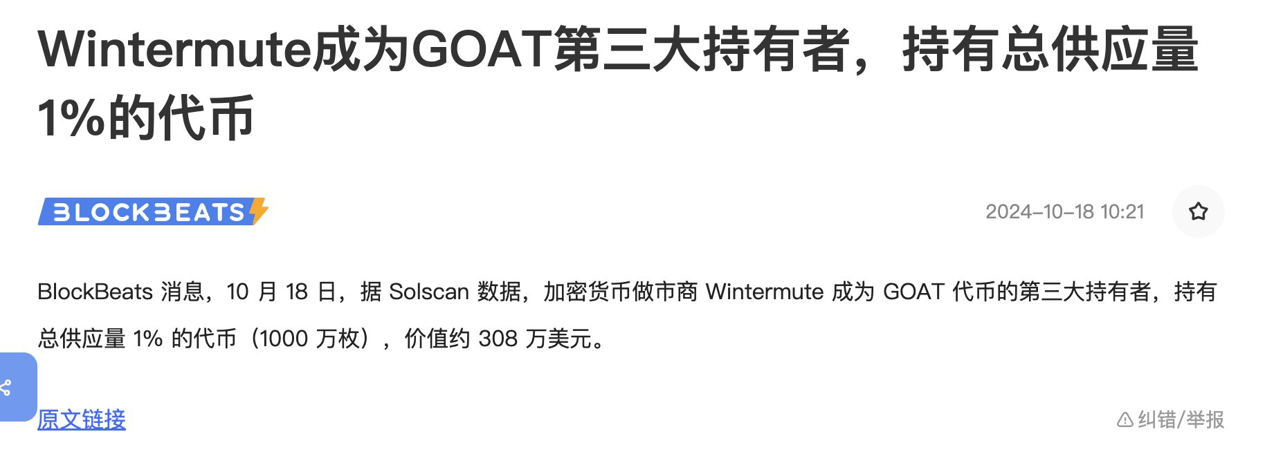 早上看到快讯「Wintermute 成为 $GOAT 第三大持有者,持有总供应量 1% 的代币」,但正如向 V 神空投代币是宣传手段一样,向做市商空投代币也不是新鲜事了。