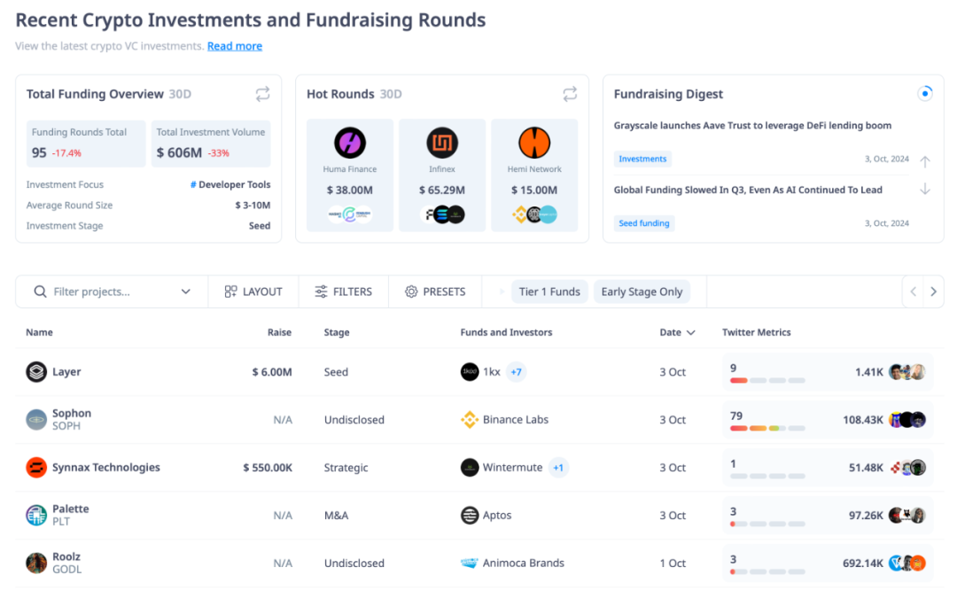 · Crypto Fundraising 是一个有价值的资源,追踪最新的募资轮次、事件和新闻。它提供尚未被其他分析平台覆盖的专案资讯。该网站还提供简单方便的资金、投资者及其联络方式的列表。