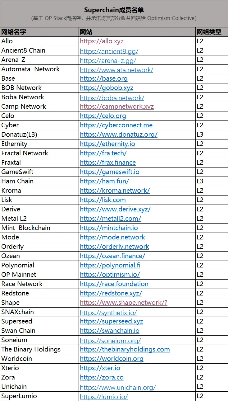 自去年6月Bedrock升级后,Optimism便为基于OP Stack搭建的L2网络引入了Superchain概念,并将自己先前的Layer2主网Optimism更名为OP Mainnet,与其它多个基于OP Stack搭建的Layer2网络合并为一个统一的OP 链网络即Superchain。