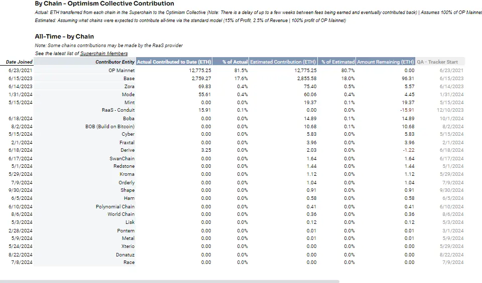 在这39个OP Stack链中,其中OP Mainnet主网的收入将全部归Optimism Collective所管,其余38个网络需要将链上排序器总收入或者纯利润的15%按最高标准上交,每月Optimism Collective都会统计各OP链的收入情况。