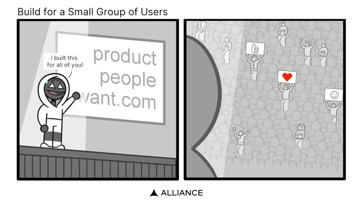 识别一群核心的早期采用者——大约 25 到 50 个真正关心你所解决问题的热情用户。通过关注他们的具体需求,你可以建立坚实的基础并培养真实的支持者。这些早期用户将提供宝贵的反馈,帮助你快速迭代和改进产品。随着时间的推移,这个过程会自然扩大你的用户群。如果人们喜欢你所构建的东西,他们推荐给朋友和家人的就会自然而然了。