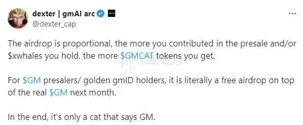 BlockBeats 消息,5 月 22 日,Whales Market 创始人 dexter 在其社交平台表示,昨日的 meme 币 GMCAT 空投是按比例的,用户在预售中贡献的越多和或持有的 xWhales 越多,则获得的 GMCAT 代币就越多。
