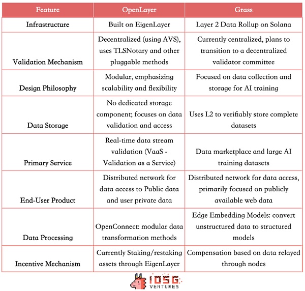 Grass使用Solana上的Layer 2 Data Rollup架构, 目前采用中心化的验证机制, 使用单一的验证器。而Openlayer作为首批AVS,基于EigenLayer构建, 利用经济激励和罚没机制实现去中心化的验证机制。并采用模块化设计,强调数据验证服务的可扩展性和灵活性。